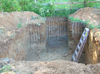 Step one: Dig a hole in the ground. We are fortunate to have a local gravedigger who is a real artist with a backhoe. He can carve a hole with straight sides almost within an inch of what you ask for.